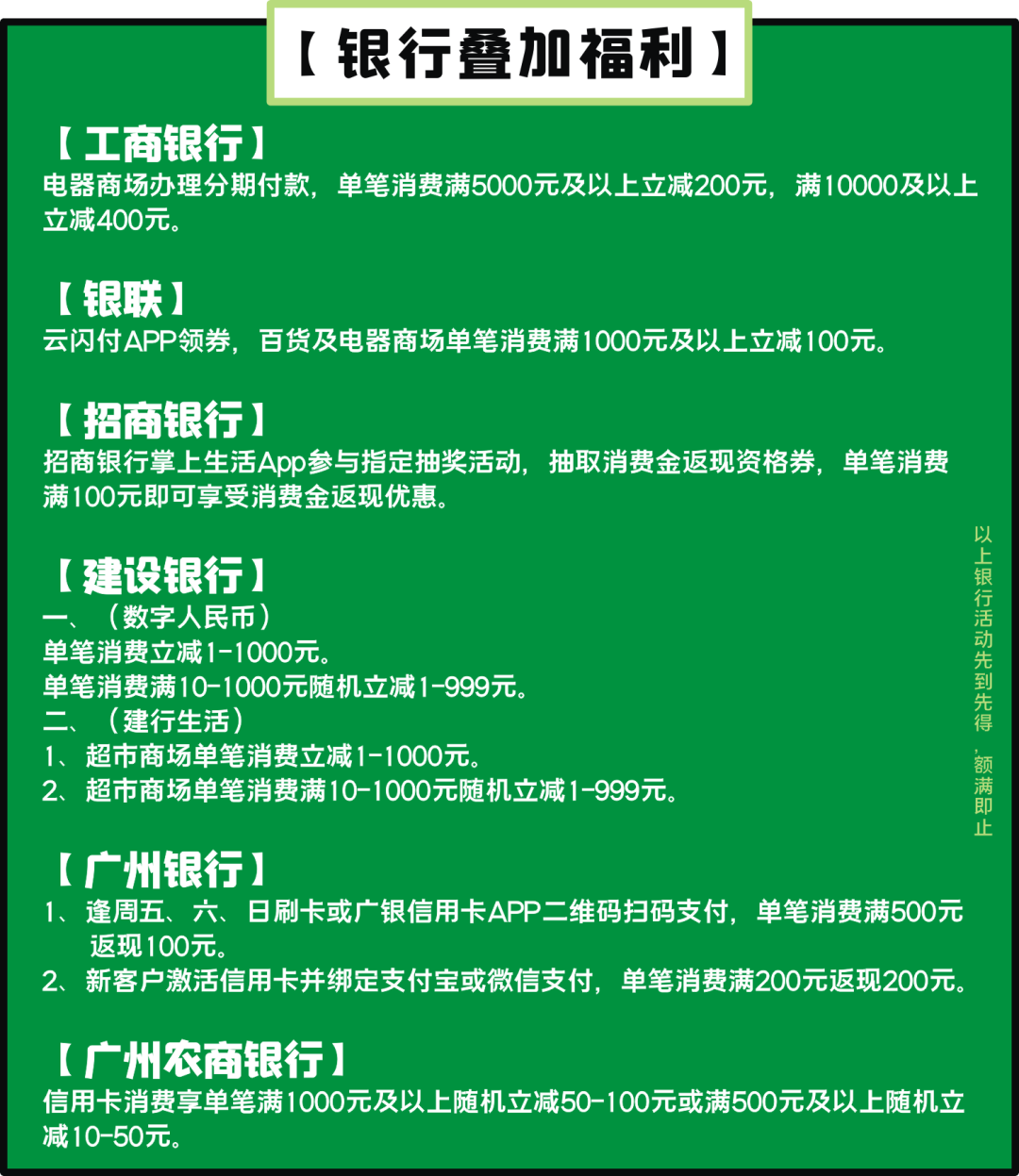 活动期间,在电器商场刷工银信用卡并现场办理分期付款,购买单件商品或多件商品累计满5000元及以上一次性刷卡立减200元、满10000元及以上一次性刷卡立减400元。活动期内每客户仅限享受1次立减优惠,名额有限,先到先得,额满即止。