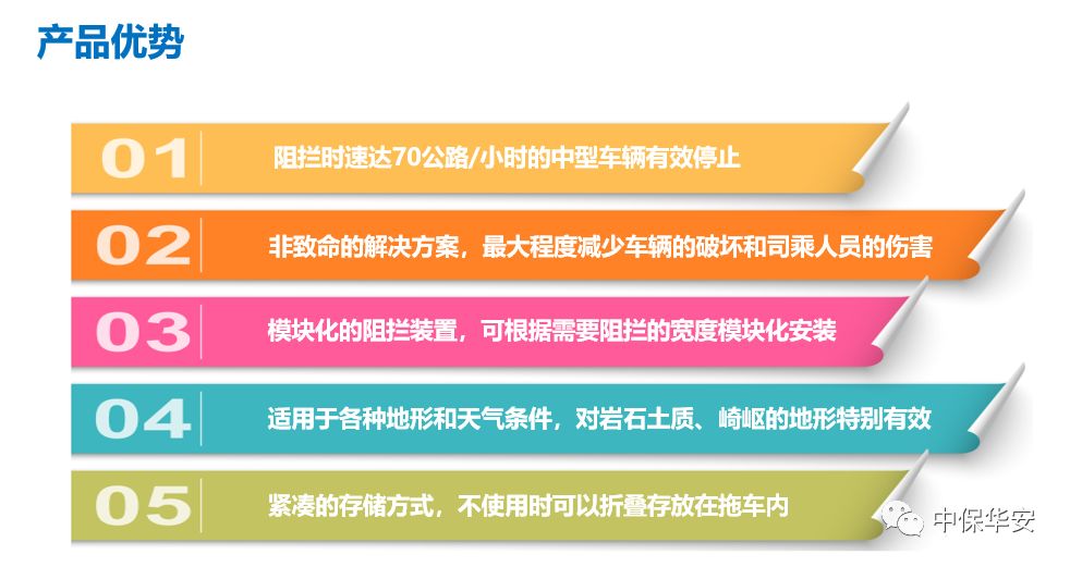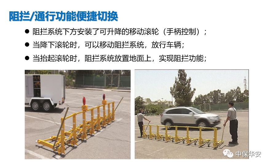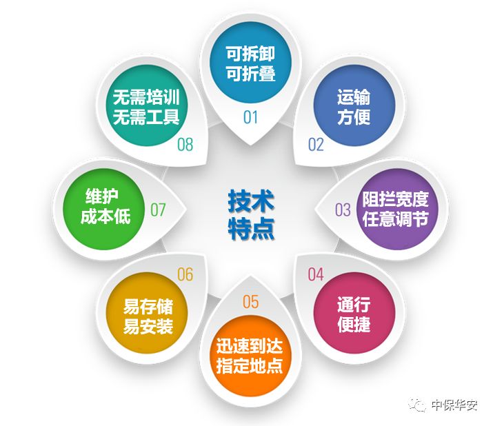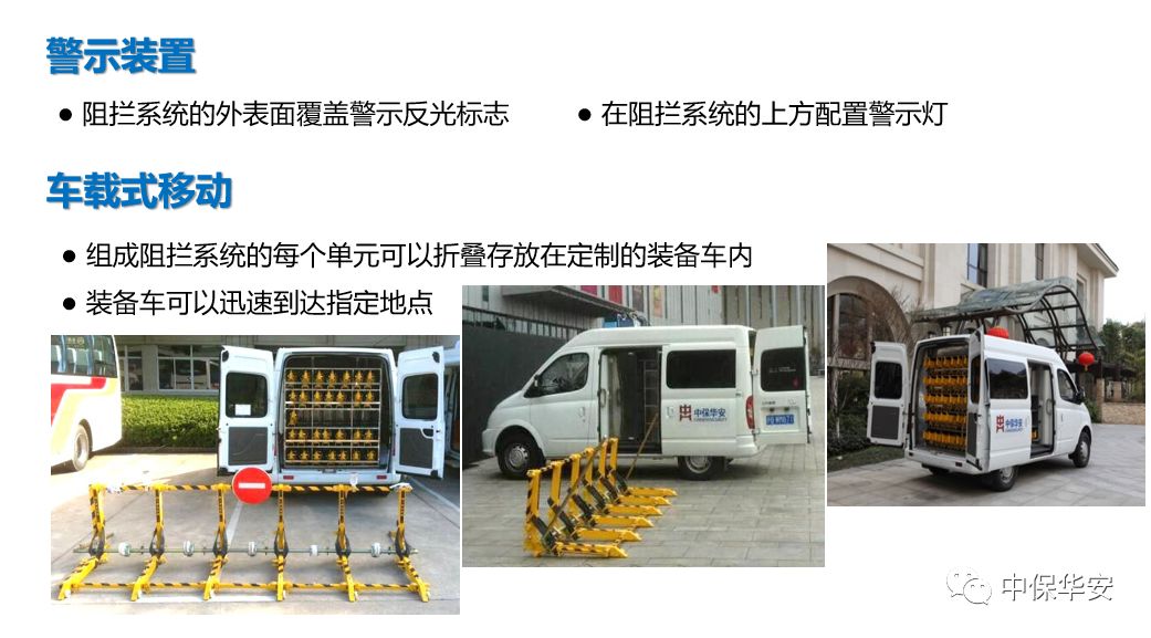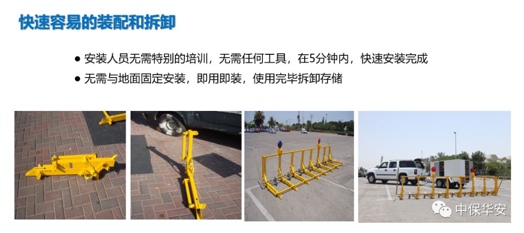 与传统路障设备相比,无需任何专用工具便可快速安装、拆卸。同时,还拥有维护成本低、便于运输、阻拦宽度可调节等优点。在反恐形势日益严峻的形势下,为交通执法、大型活动,车辆出入口、重要建筑、政府机关等提供临时、可靠、有效的安全保障。
