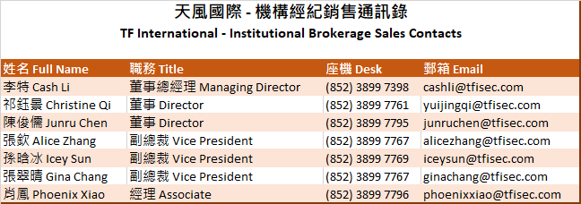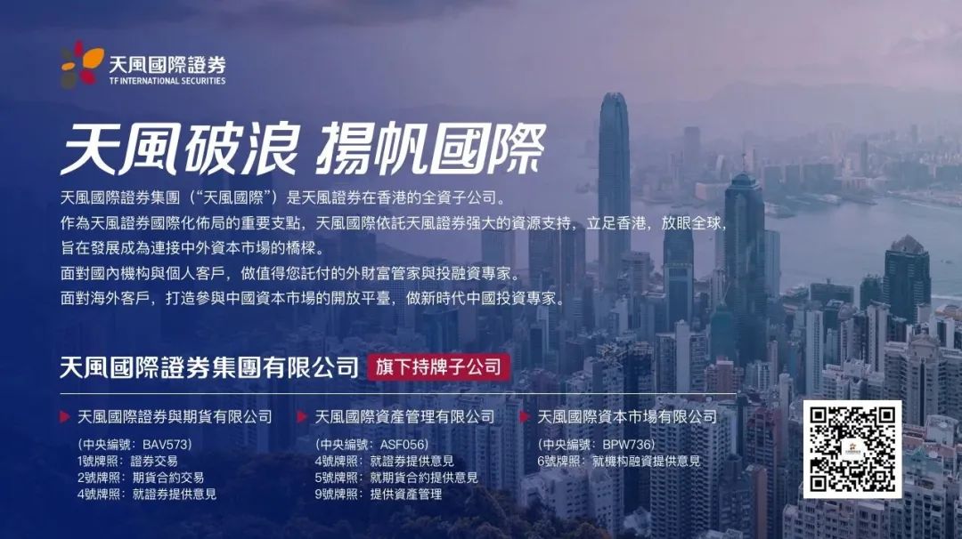 本文件由天風國際證券集團有限公司, 天風國際證券與期貨有限公司(證監會中央編號:BAV573)及天風國際資產管理有限公司(證監會中央編號:ASF056)(合稱“天風國際集團”)編制,所載資料可能以若干假設為基礎,僅供作非商業用途及參考之用途,會因經濟、市場及其他情況而隨時更改而毋須另行通知。上述內容提及的團隊成員來自天風證券股份有限公司,並非天風國際的持牌代表或員工,天風國際為天風證券股份有限公司的全資子公司。任何媒體、網站或個人未經授權不得轉載、連結、轉貼或以其他方式複製發表本檔及任何內容。已獲授權者,在使用本檔或任何內容時必須注明稿件來源於天風國際集團,並承諾遵守相關法例及一切使用的國際慣例,不為任何非法目的或以任何非法方式使用本檔,違者將依法追究相關法律責任。本檔所引用之資料或資料可能得自協力廠商,天風國際集團將盡可能確認資料來源之可靠性,但天風國際集團並不對協力廠商所提供資料或資料之準確性負責。且天風國際集團不會就本檔所載任何資料、預測及/或意見的公平性、準確性、時限性、完整性或正確性,以及任何該等預測及/或意見所依據的基準作出任何明文或暗示的保證、陳述、擔保或承諾而負責或承擔任何法律責任。本檔中如有類似前瞻性陳述之內容,此等內容或陳述不得視為對任何將來表現之保證,且應注意實際情況或發展可能與該等陳述有重大落差。本檔並非及不應被視為邀約、招攬、邀請、建議買賣任何投資產品或投資決策之依據,亦不應被詮釋為專業意見。閱覽本文件的人士或在作出任何投資決策前,應完全瞭解其風險以及有關法律、賦稅及會計的特點及後果,並根據個人的情況決定投資是否切合個人的投資目標,以及能否承擔有關風險,必要時應尋求適當的專業意見。投資涉及風險。敬請投資者注意,證券及投資的價值可升亦可跌,過往的表現不一定可以預示日後的表現。在若干國家,傳閱及分派本檔的方式可能受法律或規例所限制。獲取本檔的人士須知悉及遵守該等限制。