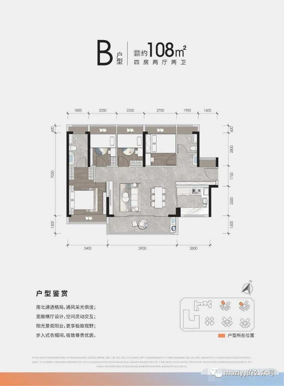 108㎡ 4房2厅2卫:稀缺南北通透4房,约5.9米阔绰阳台,三分离卫生间
