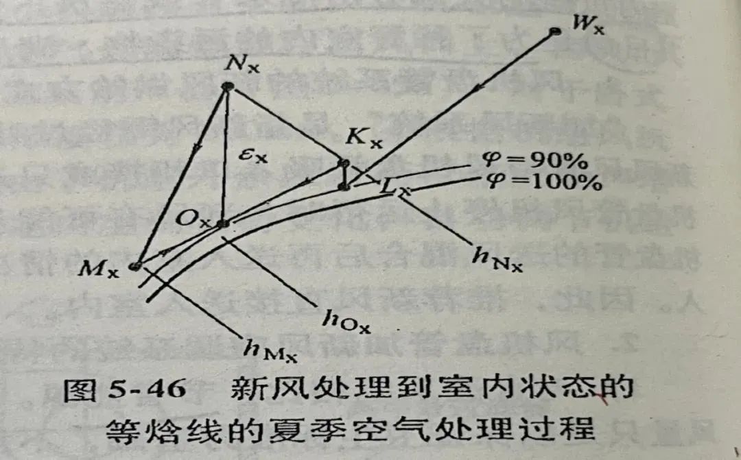 可求出hmx,hmx线与线段KxOx的延长线相交得Mx点。连接线段NxMx,Nx—Mx是在风机盘管内实现的冷却减湿处理过程。