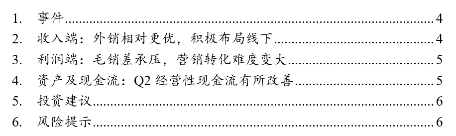 报告导读:公司业绩短期承压,存在以价换量趋势,外销表现更优,线下拓展积极。增持。