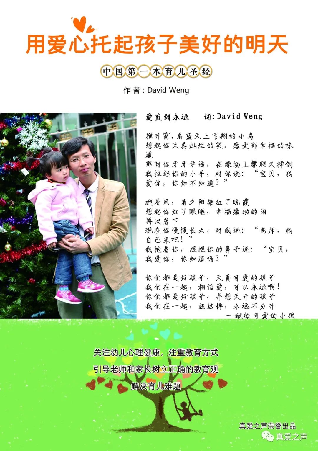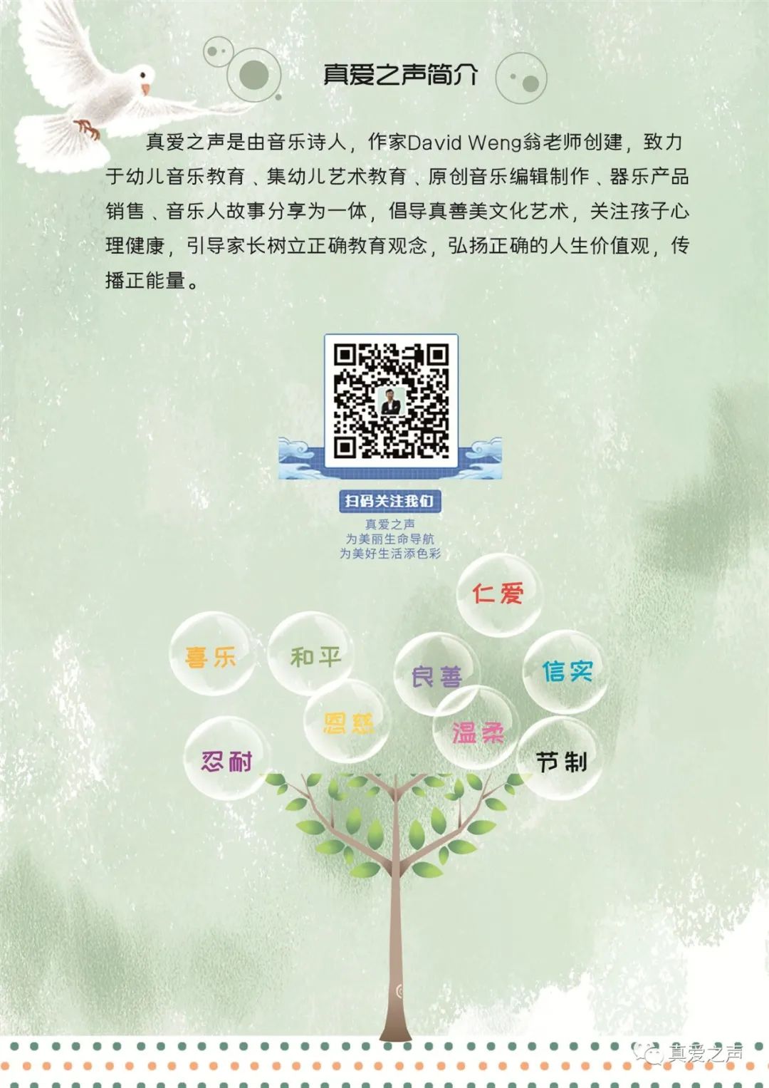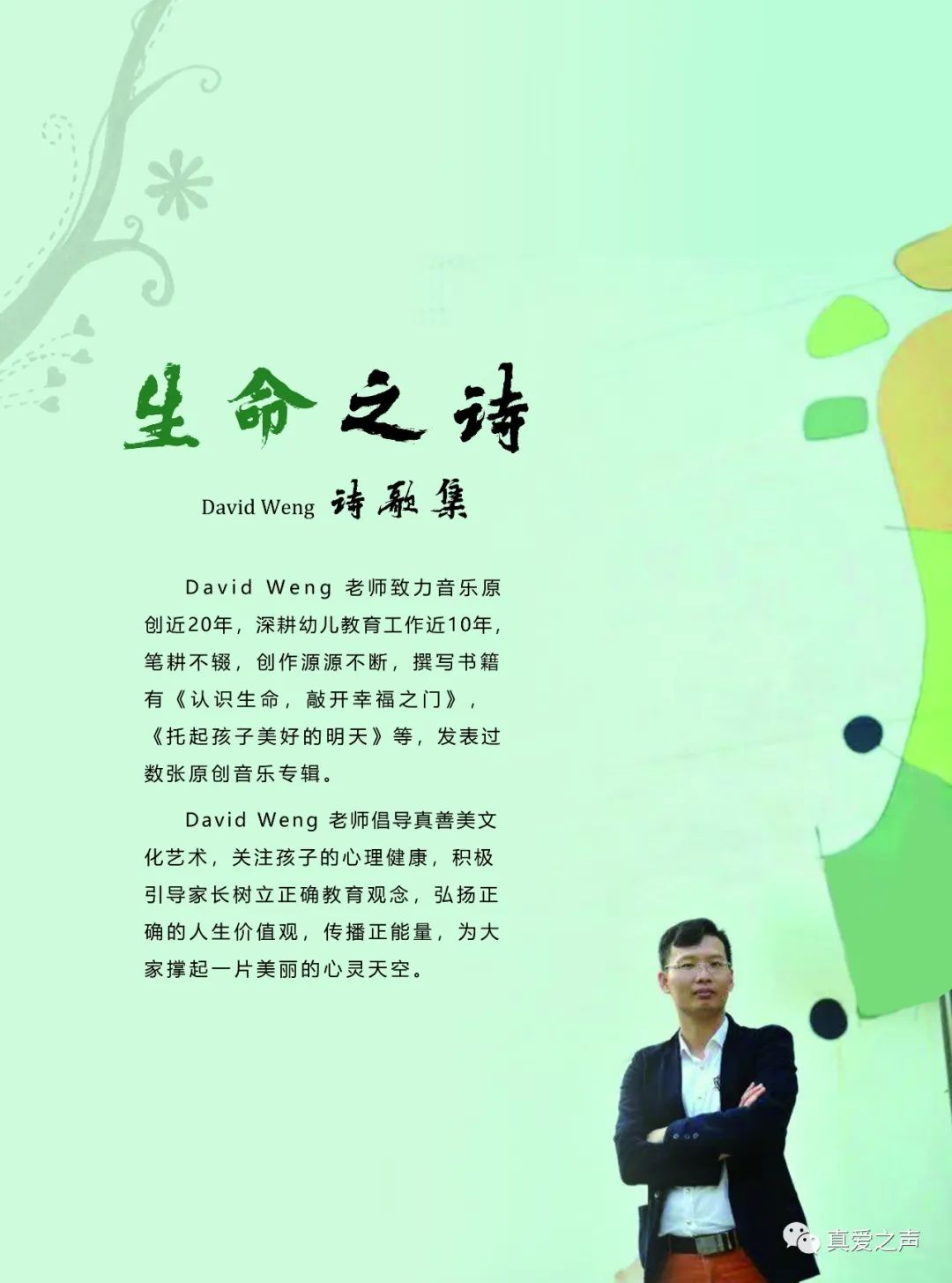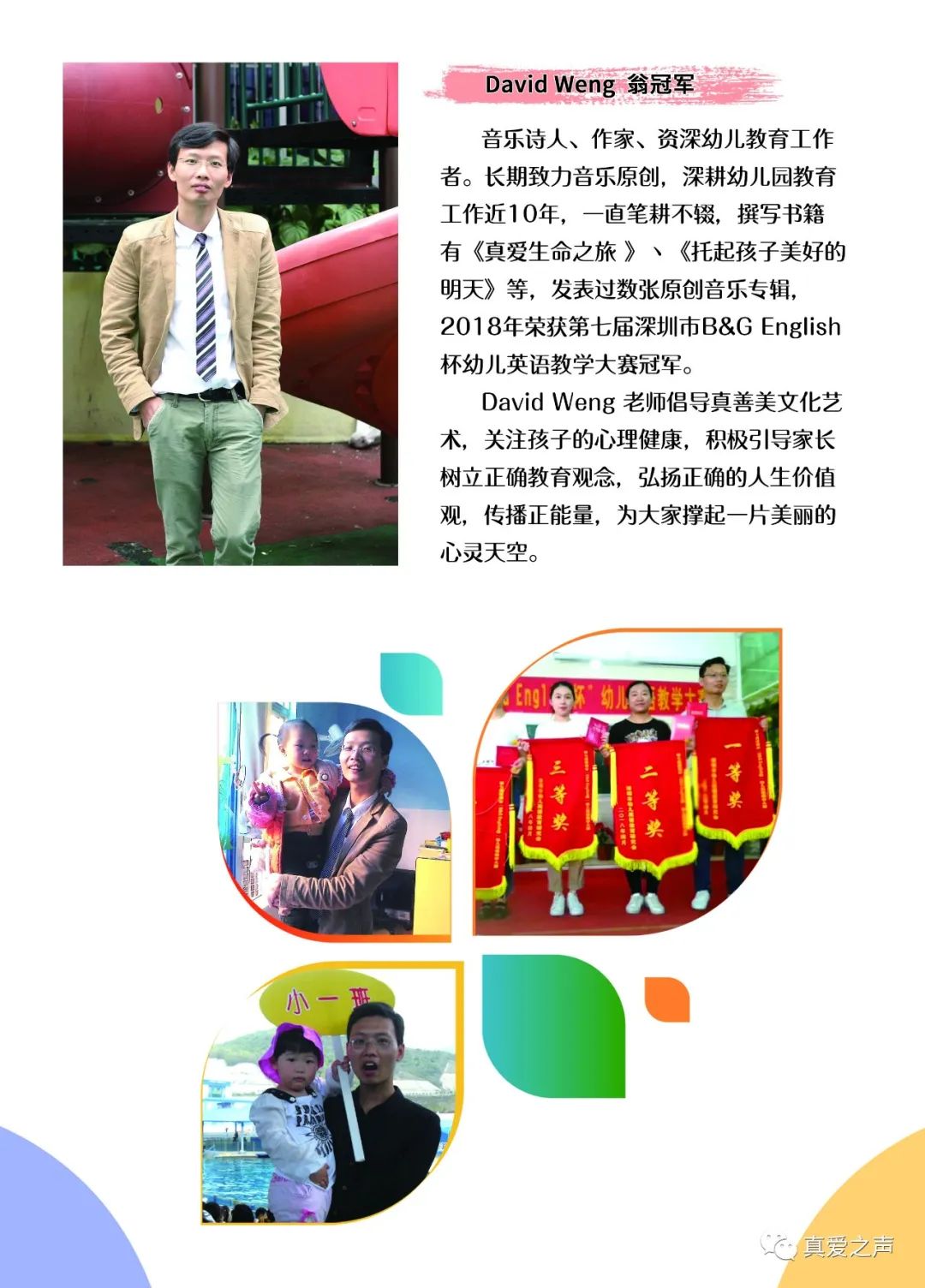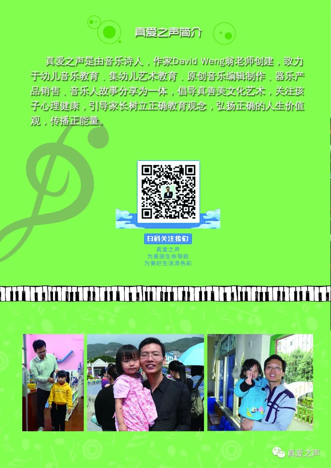 真爱之声工作室是由音乐诗人,作家David Weng翁老师创建,致力于幼儿音乐教育﹑集幼儿艺术教育培训﹑原创音乐编辑制作﹑录音﹑器乐产品销售﹑音乐人故事分享为一体,倡导真善美文化艺术,关注孩子心理健康,引导家长树立正确教育观念,弘扬正确的人生价值观,传播正能量。