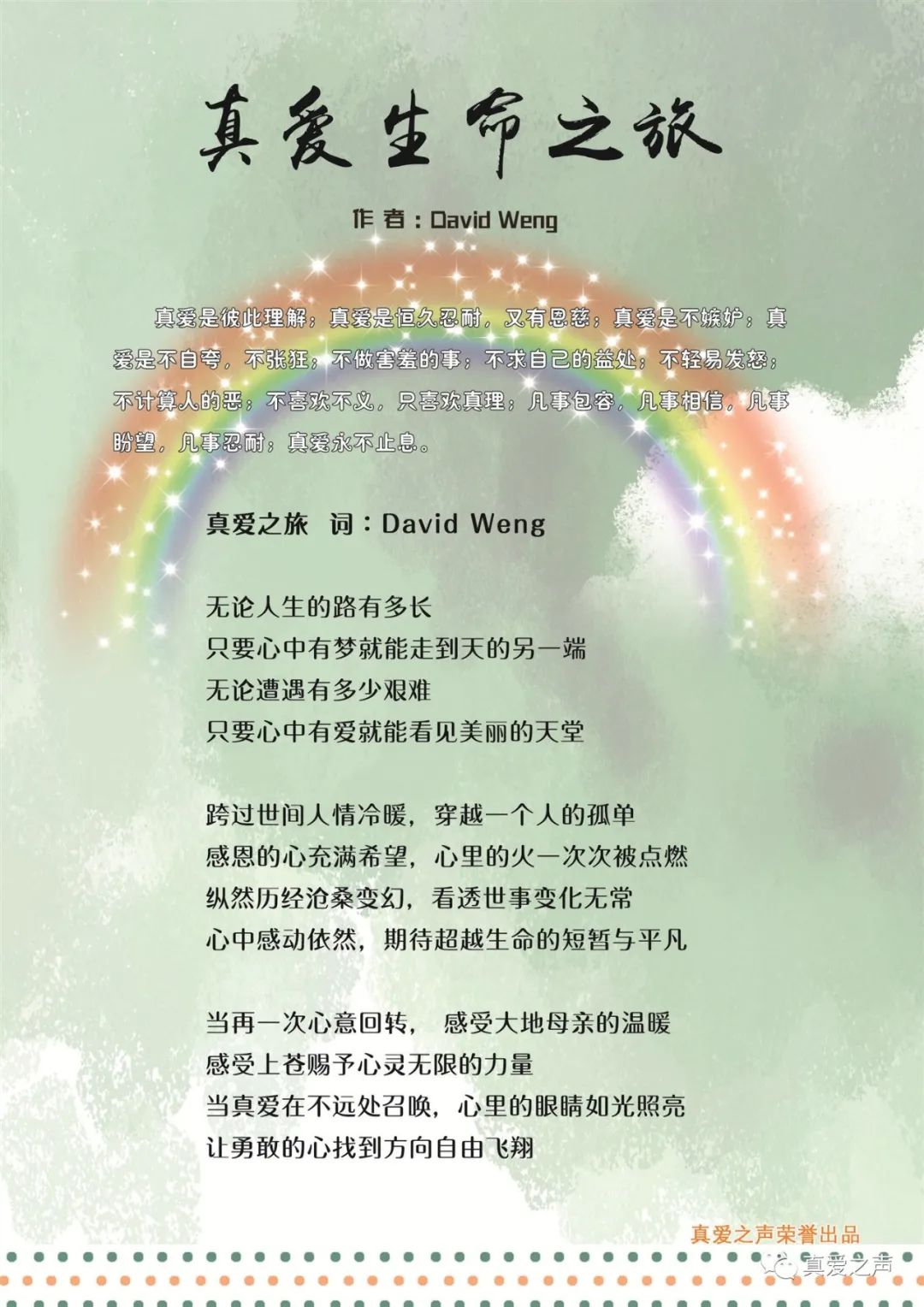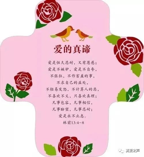 真爱是彼此理解,真爱是恒久忍耐,又有恩慈;真爱是不嫉妒,真爱是不自夸,不张狂,不做害羞的事,不求自己的益处,不轻易发怒,不计算人的恶,不喜欢不义,只喜欢真理;凡事包容,凡事相信,凡事盼望,凡事忍耐;