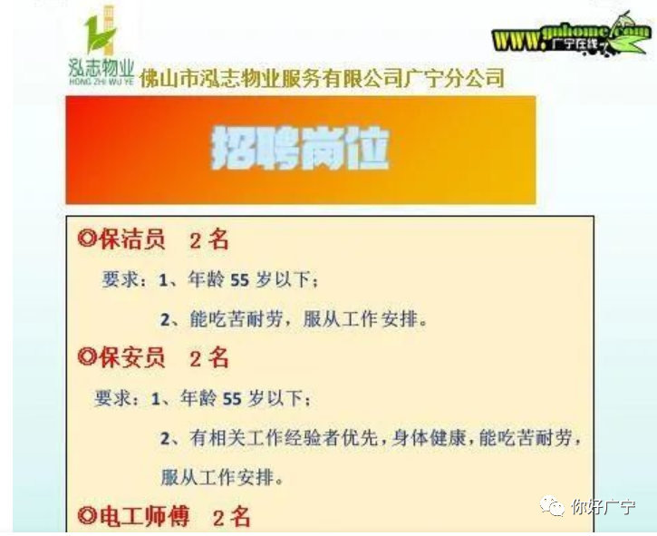 佛山市泓志物业服务有限公司广宁分公司,因业务发展需要,现面向社会招聘职位如下: