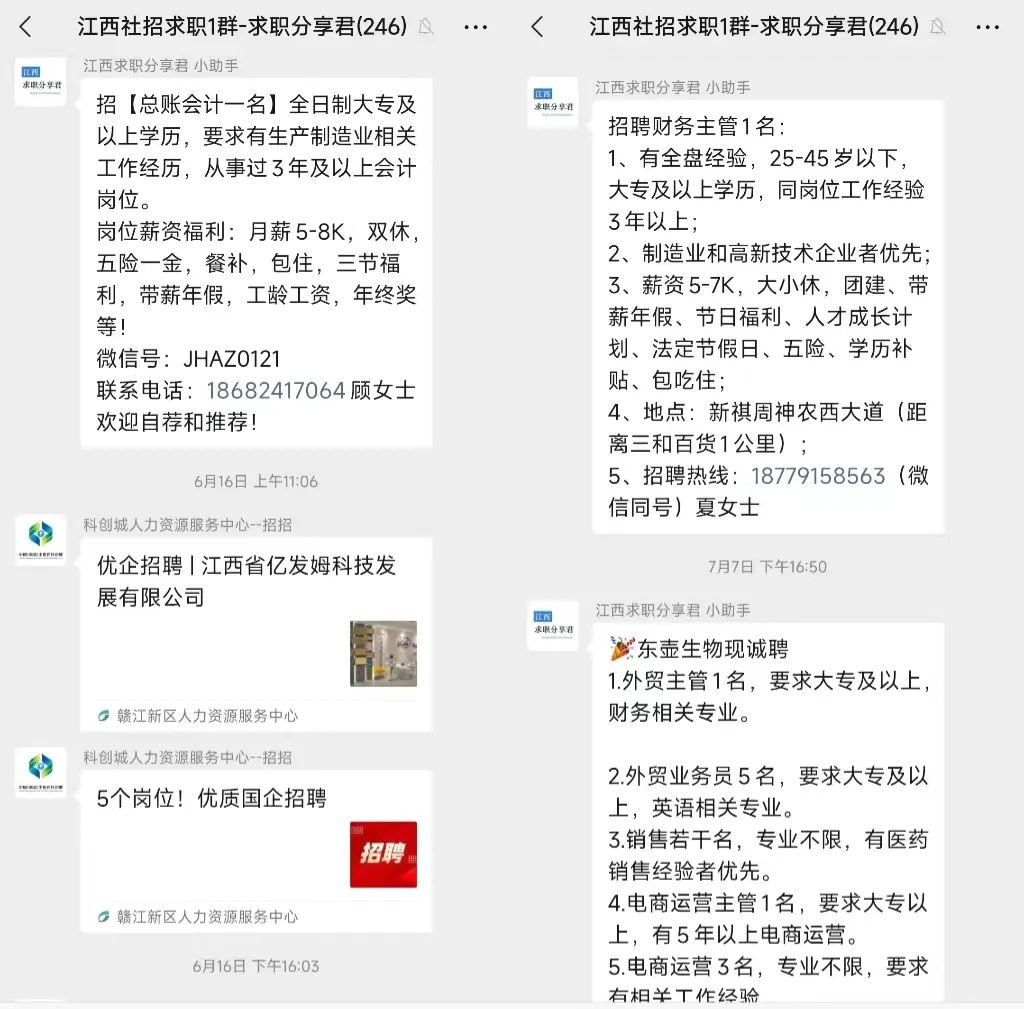 小助手负责整个社群的管理,每天是第一时间给大家发放最新招聘信息,有任何疑问都可以@江西求职分享君帮你解决!群内偶尔会有内推消息,一般不在公众号公开发布!