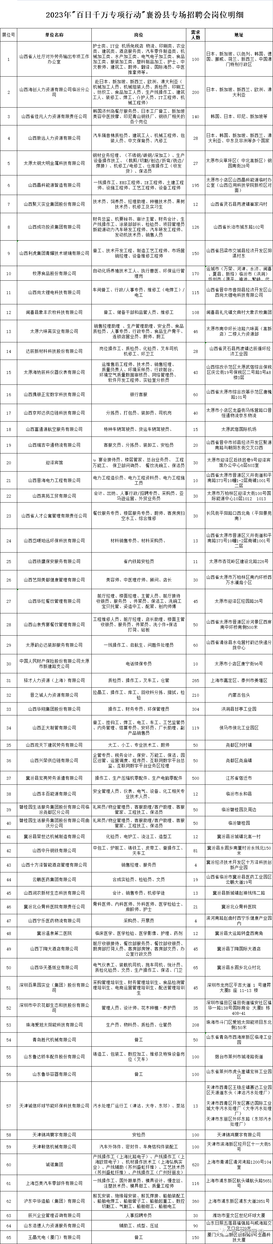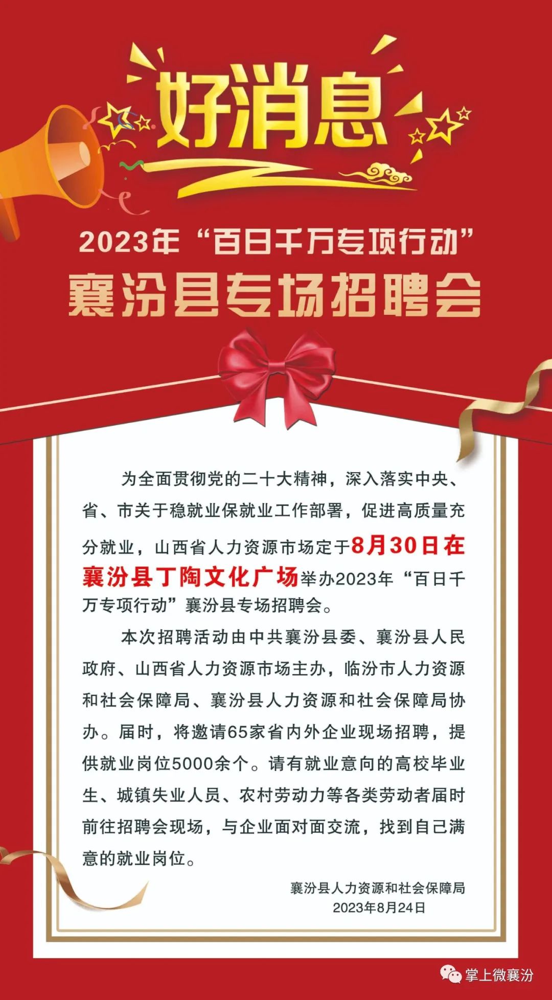 为全面贯彻党的二十大精神,深入落实中央、省、市关于稳就业保就业工作部署,促进高质量充分就业,山西省人力资源市场定于8月30日在襄汾县丁陶文化广场举办2023年“百日千万专项行动”襄汾县专场招聘会。