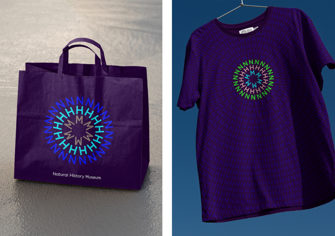 新引入了一个圆形符号,将博物馆的名称缩写为NHM;每个字母都形成一个圆,或者一个圆内含一个圆。这个符号的理念是要引用"我们的星球和自然界万物之间的普遍联系",并代表"从中心脉动形成三色日晕的涟漪效应的能量"。根据Pentagram的说法,"它是从自然界诞生的形状——体现了集体能量和积极性,反映了博物馆成为变革力量的使命"。