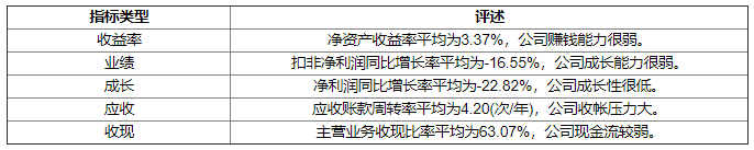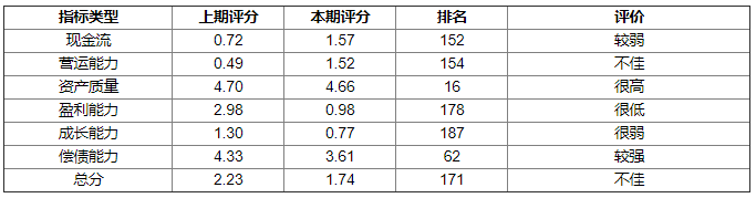综合来看,渝三峡A总体财务状况不佳,当前总评分为1.74分,在所属的化学制品行业的220家公司中排名靠后。具体而言,盈利能力、成长能力很弱,现金流、营运能力较弱,偿债能力良好,资产质量优秀。