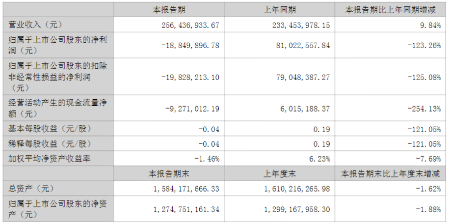 从营收和利润方面看,公司本年度实现营业收入2.56亿元,同比增长9.84%,净亏损1884.99万元,同比止盈转亏,去年同期净利8102.26万元,基本每股收益为-0.04元。
