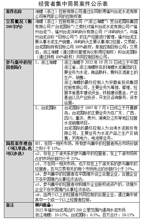 福州台泥主要从事水泥生产销售,洋屿码头主要从事港口经营。交易前,台泥国际持有目标公司100%股权,单独控制目标公司;交易后,浙江海螺(通过委托管理协议取得控制权)和台泥国际(通过持有100%股权)共同控制目标公司。