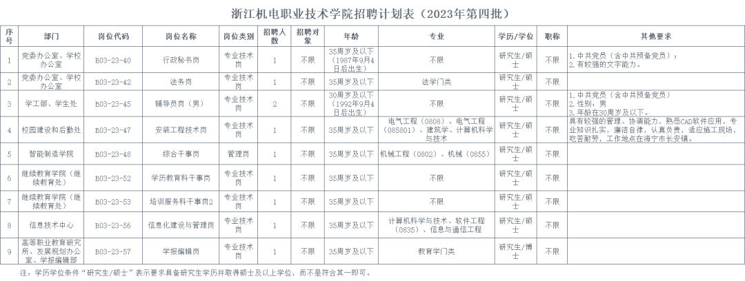 浙江机电职业技术学院招聘计划表(2023年第四批).xlsx