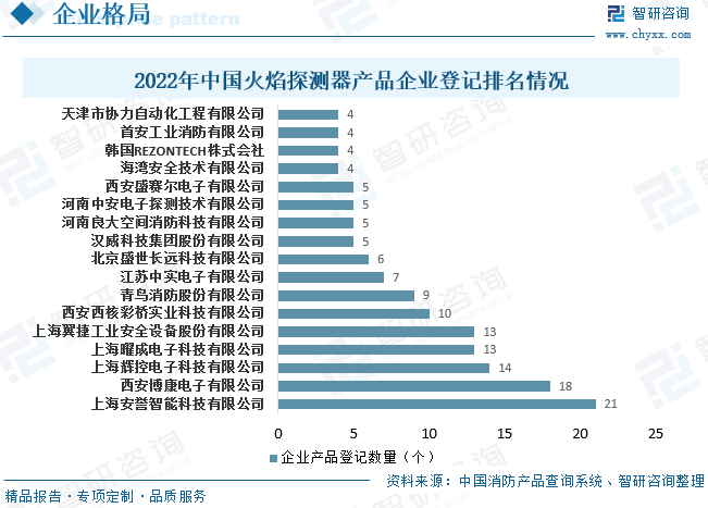 从国内火焰探测器市场竞争来看,截止到2022年5月,我国火焰探测器产品登记在案(在有效期内)的共计210个,处于第一位的是上海安誉智能科技有限公司,获得了21个有效产品认证,其次为西安博康电子有限公司,获得了18个有效产品认证。分类别来看,点型红外火焰探测器产品登记数前三为:上海安誉智能科技有限公司、西安博康电子有限公司、青鸟消防,产品登记数分别为:8、6、5个,点型紫外火焰探测器产品登记数前三为:上海安誉智能科技有限公司、西安博康电子有限公司、上海辉控电子科技有限公司,产品登记数分别为:13、12、10个。
