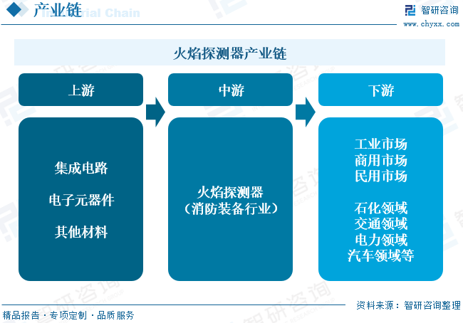 火焰探测器行业产业链上游主要为集成电路、电子元器件等,行业上游电子元器件、集成电路等领域供应材料的效率、质量和价格,一定程度上影响了火焰探测器的交货周期、产品质量和价格竞争力。火焰探测器可应用于需要快速检测明火发生的场景,下游应用行业(及主要应用场景)包括石油石化(油库、管线)、交通(公路隧道、地铁、机场)、市政设施(地下管廊)、电力(换流站、变压器、风力发电设备)、汽车(生产车间)、食品(酒窖酒库)等,产品市场空间较为广阔。特别是军工、半导体等行业的快速发展和安全防范要求提高,对性能质量更好的高端火焰探测器的需求也在不断提升。