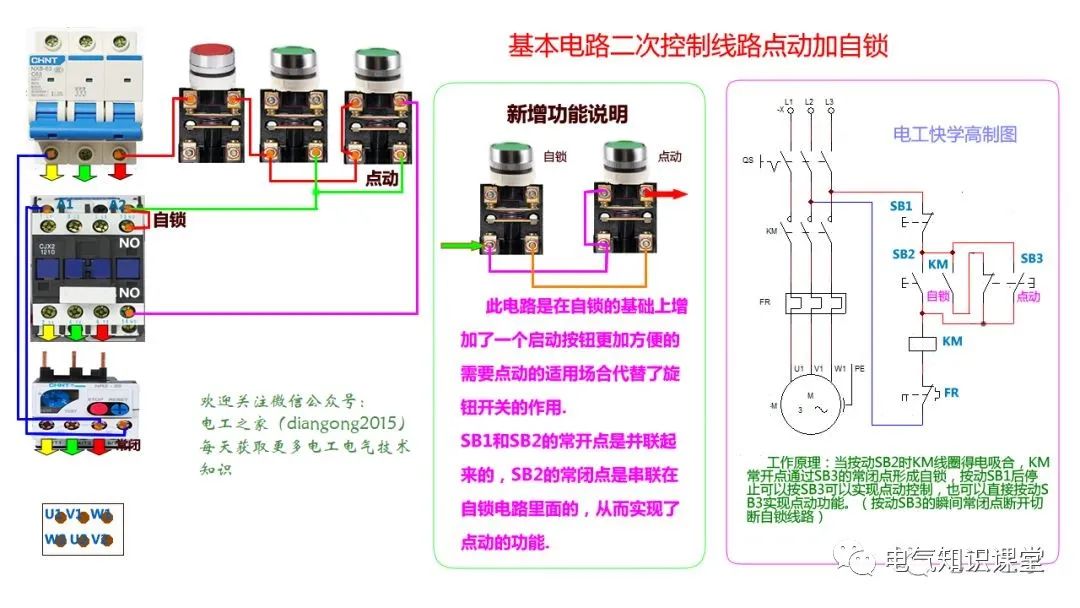 实际应用中:自锁电路用的是接触器的常开触点,和启动按钮并联。