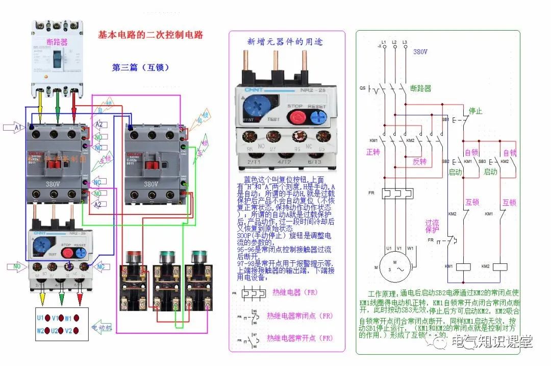 实际应用中:接触器的互锁电路中,使用的是接触器的常闭点,和互锁的接触器线圈串联。