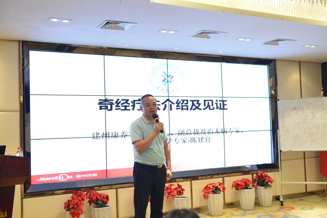 建州康养集团副总裁陈建良奇经传承归来,为大家详细介绍了奇经疗法及见证,通过对新引进项目和产品的介绍,以及现场体验式的展现,让建州家人对建州产品有了直观的了解,增强了对奇经疗法业务的信心。
