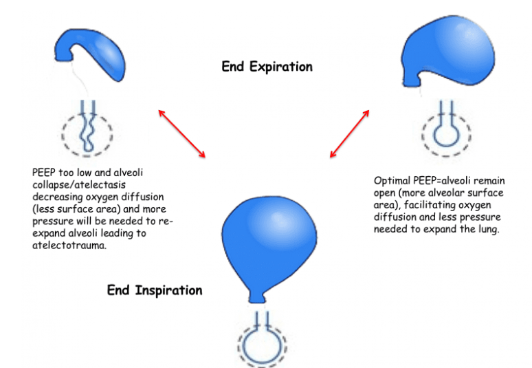 现在想象一下,您让肺泡在两次呼吸之间完全塌陷(PEEP 不足),这将无法在呼气期间提供足够的氧合,并且您需要施加更大的压力才能打开肺泡,更不用说随后扩张肺部了。肺泡的这种重复打开和关闭会导致剪切应力或肺不张损伤(VILI 的另一种形式),并可能加重患者的肺损伤。