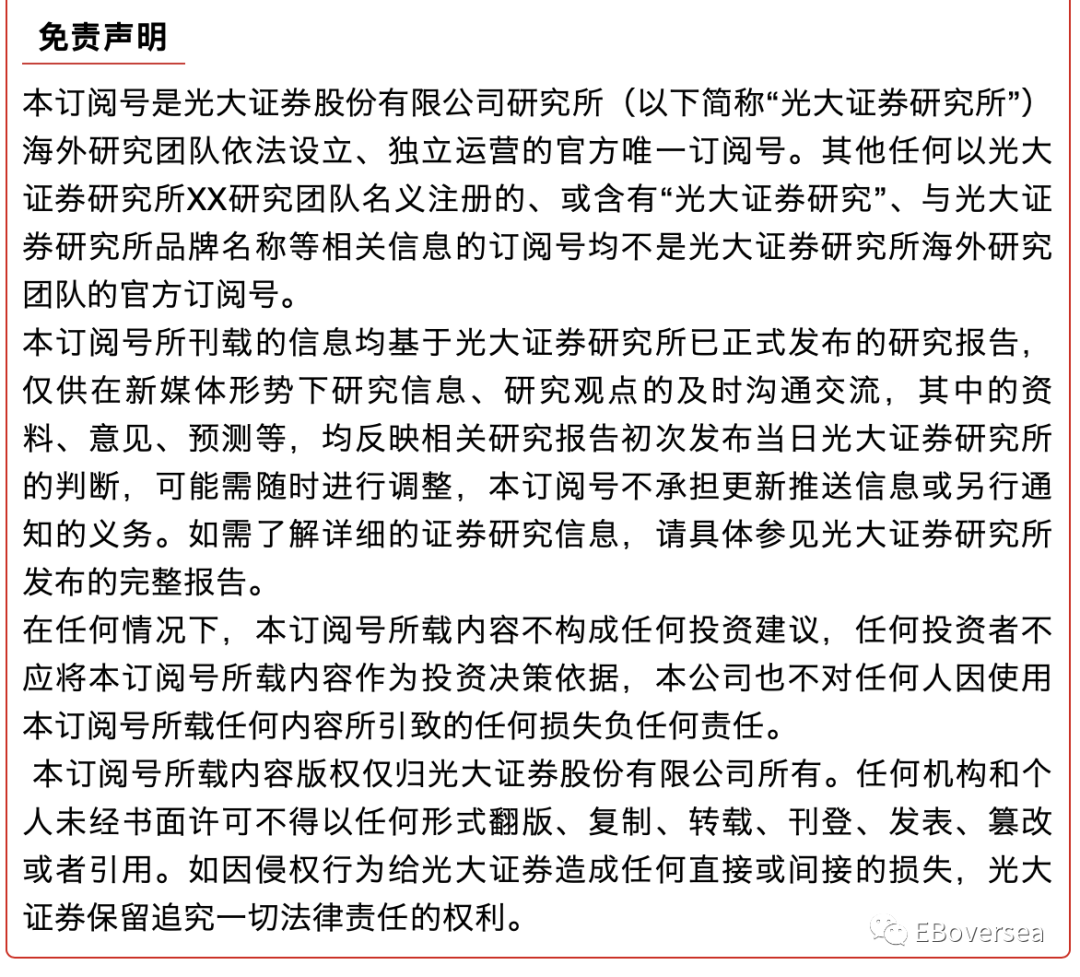 【特别提示】本订阅号中所涉及的证券研究信息,均取自于光大证券已正式外发研究报告,由光大证券海外研究团队(TMT/消费/医药/制造等)编写,仅面向光大证券专业投资者客户,用作新媒体形势下研究动态的宣传。研究报告有时效性,任何研究报告内容仅代表报告外发时特定时点的研究信息汇总,任何关于研究报告、研究观点的解读,请联系对口销售或具体研究员。非光大证券专业投资者客户,请勿订阅、接收或使用本订阅号中的任何信息。本订阅号难以设置访问权限,若给您造成不便,敬请谅解。光大证券研究所不会因关注、收到或阅读本订阅号推送内容而视相关人员为光大证券的客户。