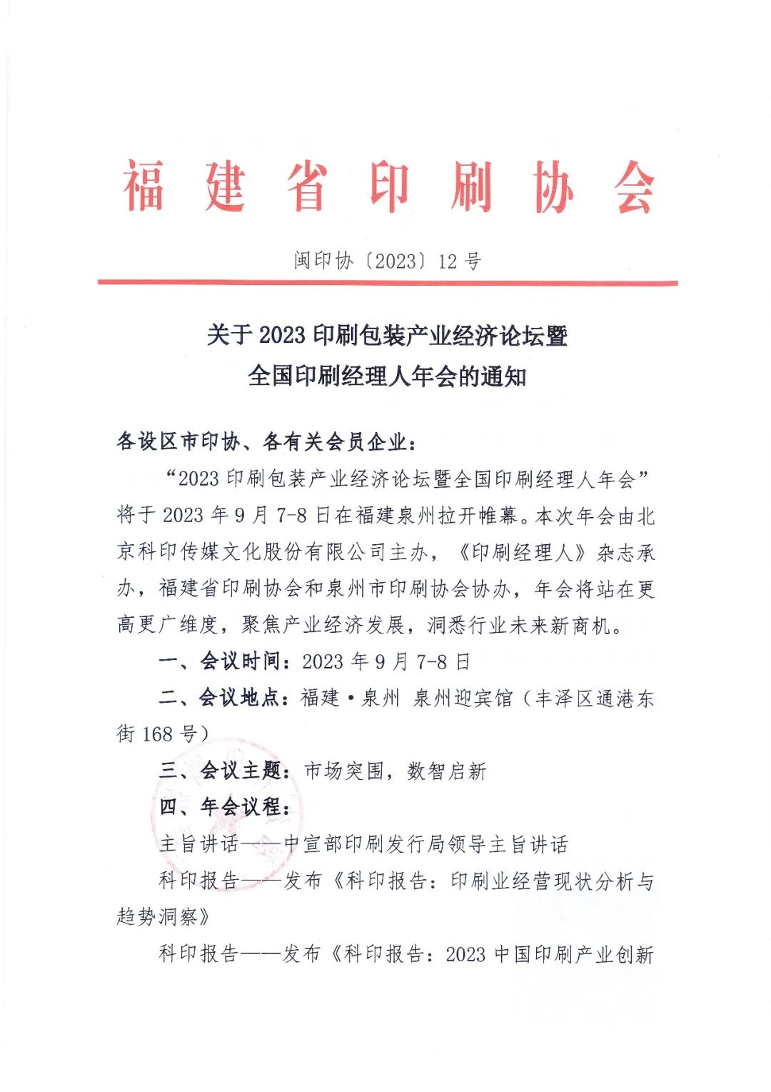 关于2023印刷包装产业经济论坛暨全国印刷经理人年会通知