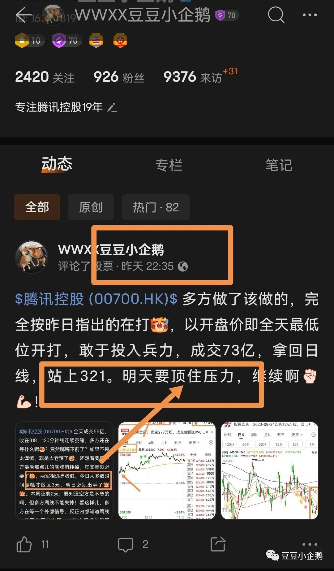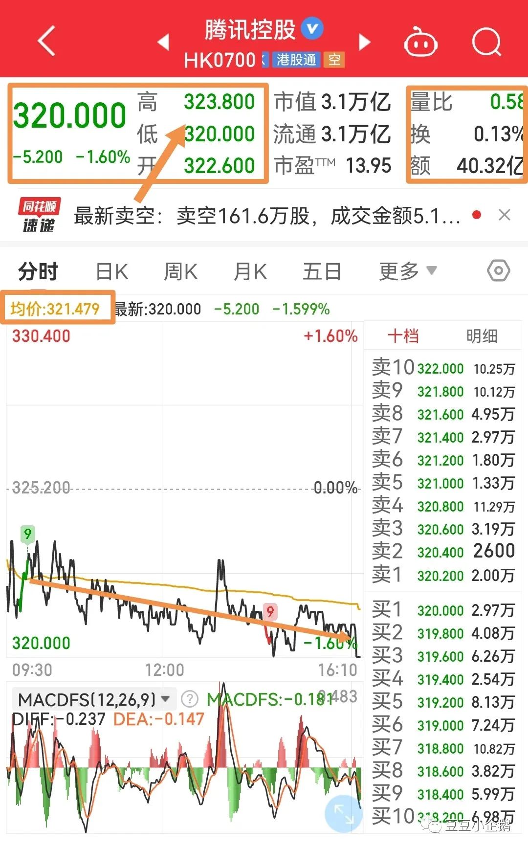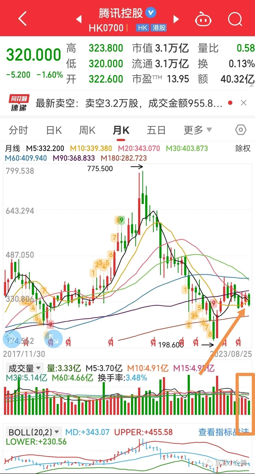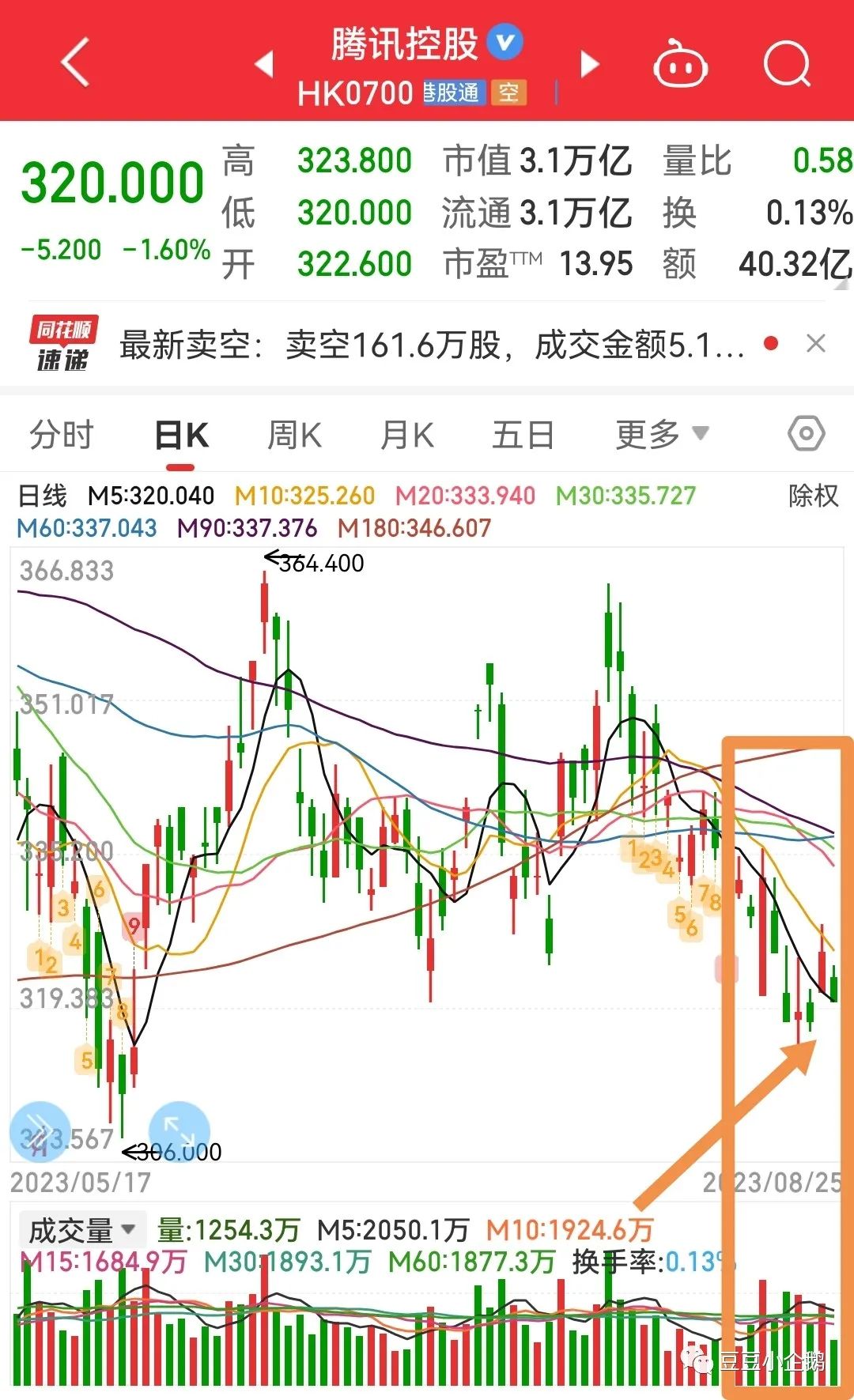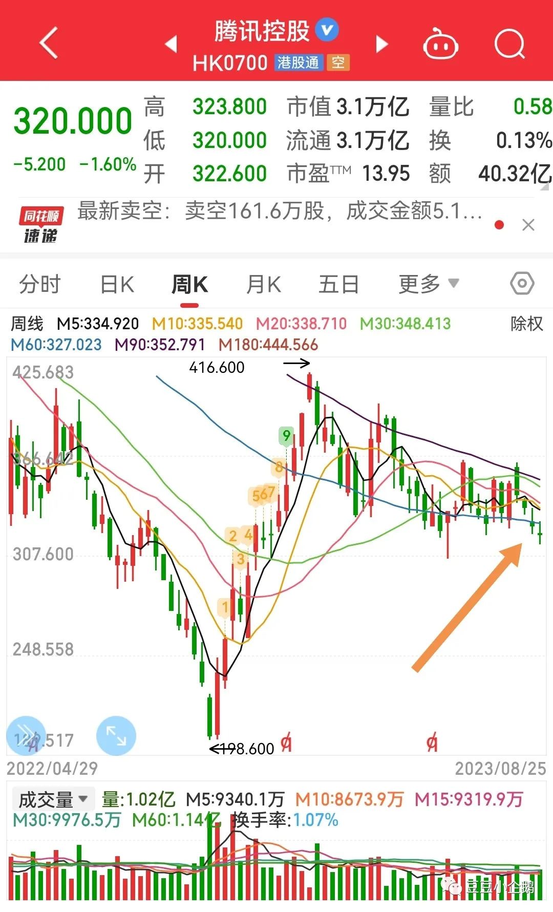 多方还是没能顶住压力,没有继续前进,勉强守住320。基本被压制在321日均线下。但好在空方也不敢发力,全天缩量成交40亿,振幅只有3.8元。本周多方周线还是失掉了,但欣慰的是:打了个比上周放量的底部十字星,连续四周下跌后,依托月线,还是有机会站上339-341的,因为331是不能够失守的,本周没能攻上330-332,危险的,下周换人上,也得拿下。