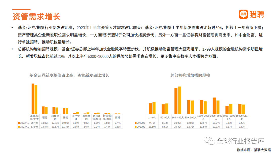 •基金/证券/期货行业新发占比高,2023年上半年资管人才需求占比增长:基金/证券/期货上半年新发需求占比超过50%,但较上一年有所下降;资产管理类企业新发职位需求明显增长,一方面银行理财子公司加快拓展步伐;另外一方面一些证券将财富管理剥离出来,如中金财富,进行单独招聘,推动职位量增长。