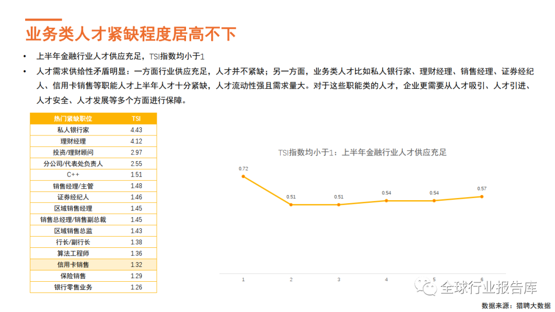 •人才需求供给性矛盾明显:一方面行业供应充足,人才并不紧缺;另一方面,业务类人才比如私人银行家、理财经理、销售经理、证券经纪人、信用卡销售等职能人才上半年人才十分紧缺,人才流动性强且需求量大。对于这些职能类的人才,企业更需要从人才吸引、人才引进、人才安全、人才发展等多个方面进行保障。