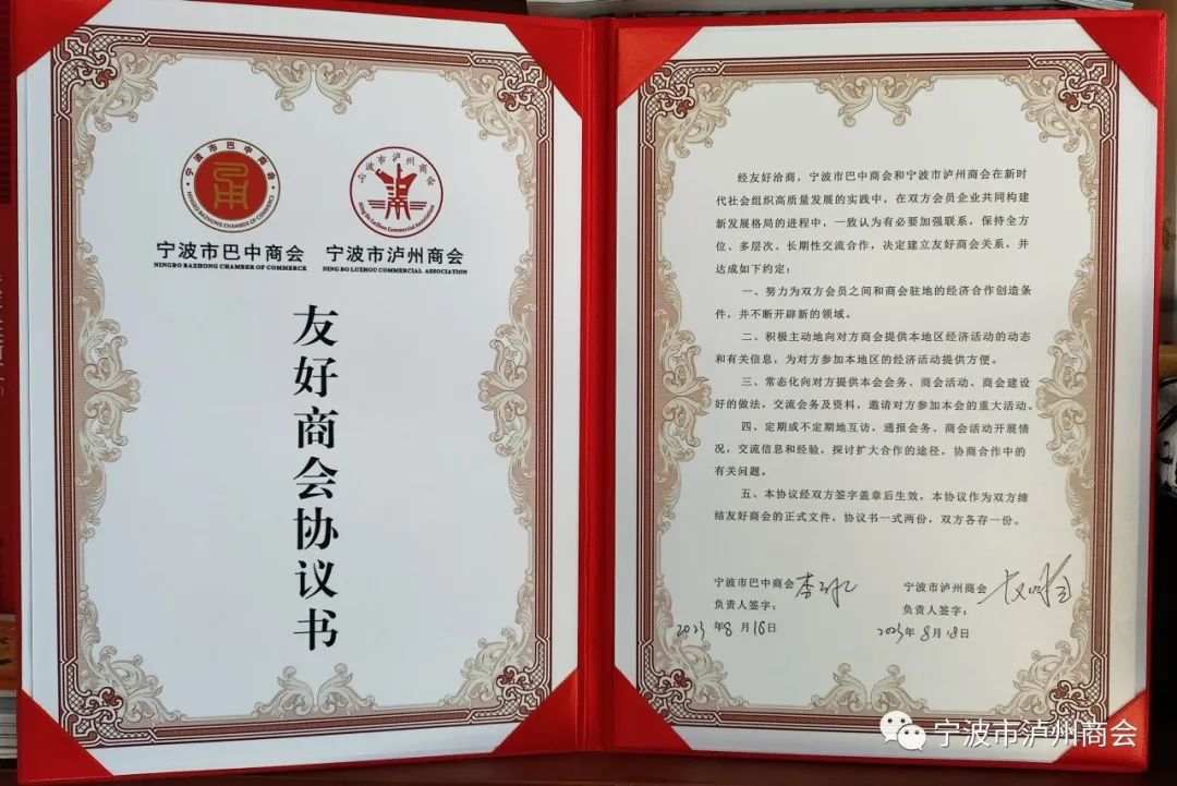 在会议中,宁波市巴中商会分别与温州市巴中商会、上海市巴中商会、常州巴中商会,宁波市泸州商会、宁波市广元商会签署“友好商会”协议。宁波市泸州商会与宁波市巴中商会同为巴蜀子弟,经历相似、品格相近、精神相通,是血脉相联的同乡,又是离家创业的近邻,今天两会缔结为友好商会,是深化我们团结共赢的起点,两会携手共谋发展,能够汇聚起更高的智慧,凝聚起更大的力量,建立起更多的协作,创造出更多的精彩,为川甬两地经济发展作出新的更大贡献。