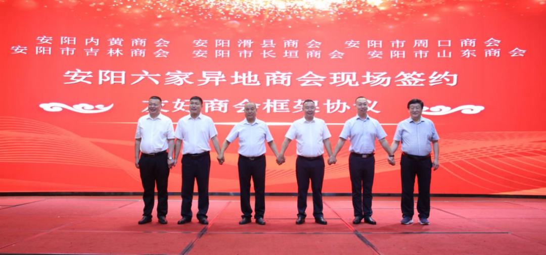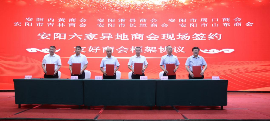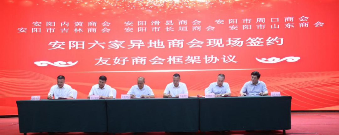 2023年8月25日,秋高气爽,阳光普照,安阳内黄商会、安阳滑县商会、安阳市周口商会、安阳市吉林商会、安阳市长垣商会、安阳市山东商会在安阳迎宾馆隆重召开安阳异地商会学习贯彻《中共中央国务院关于促进民营经济发展壮大的意见》座谈会暨友好商会签约仪式。原市人大副主任、市老龄委常委副主任吴水和、原市人大常务副主任张善飞、安阳市工商联专职副主席张洁及有关部门领导,安阳市民政局党组成员,一级调研员王德喜、安阳市民政局党组成员,副局长狄永军、文峰区人民政府副区长王伟、内黄县政协副主席、县工商联主席王永斌、原安钢集团公司副总经理张清学、原安阳市政法委副书记张兵、原安阳市政法委副书记张汉芳、原安阳市人大常委副秘书长许中甫、 原安阳市政府副秘书长王长生、原安阳市委宣传部副部长张健、原安阳市人大常委会农工委副主任、市畜牧局局长赵民才、原市水利局局长郑国宏、原市政协社发委主任韩兵、原市盐业局局长孟春维、原安阳市工商局正处级调研员王栋芝、原文峰区人大常务副主任尚红军、原安阳市直工委副书记王录成、安阳市工商联组宣部部长史伟、原市公安局政治部副主任谢建萍、安阳市54853部队副部队长贾西录、内黄县委统战部常务副部长刘宝志、文峰区统战部副部长、区工商联党组书记李海平、内黄县统战部副部长、县工商联党组书记魏廷民、安阳市周易研究会会长、安阳师范学院教授王志轩、内黄县工商联副主席王卫锋、殷都区工商联副主席刘翠利、内黄县工商联秘书长路军周、内黄县工商联办公室主任谭计国、安阳市会长联谊会会长刘贵生、 安阳市会长联谊会秘书长王艳生、 河南深圳商会会长王华勋、安阳市副食品商会会长陈现彬、 安阳市电动车商会赵红军、 安阳市粮油商会会长王革平、 安阳市针织商会会长张运海、 安阳市浙江商会常务副会长兼秘书长胡哲玮、 安阳市化工商会会长郭建庄、 文峰区糖烟酒商会会长谢德强、 文峰区服装会长张俊峰、 龙安区贡杏协会会长李集强等260人参加会议。
