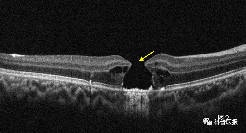 图2 激光笔照射后导致黄斑全层裂孔(黄箭头)