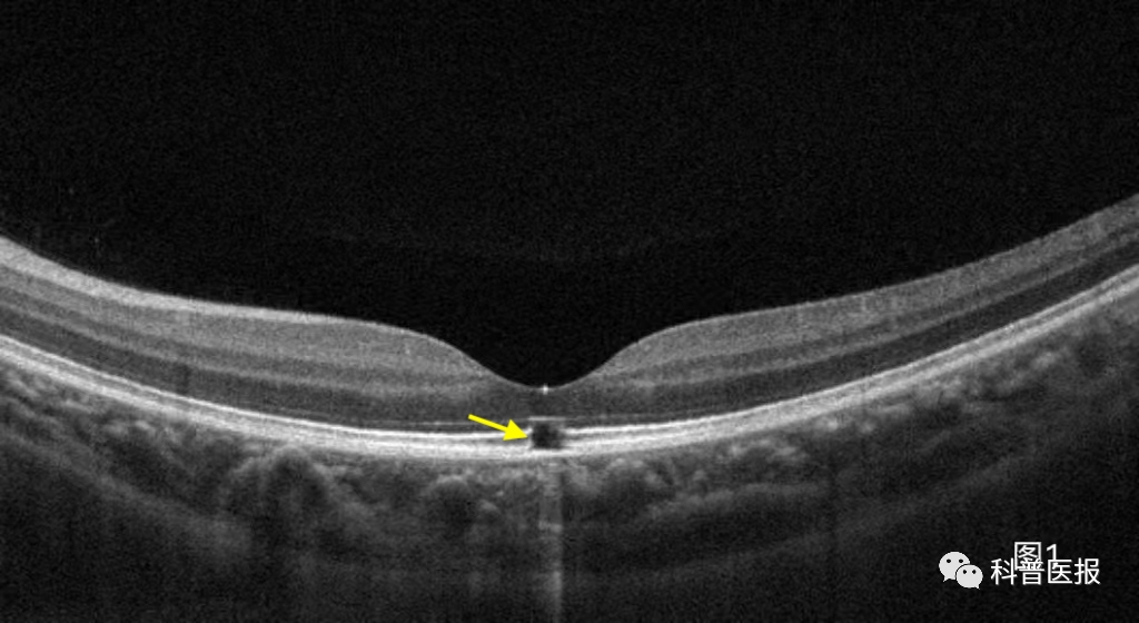 图1 激光笔照射后导致黄斑中心凹区外层缺失断裂(黄箭头)