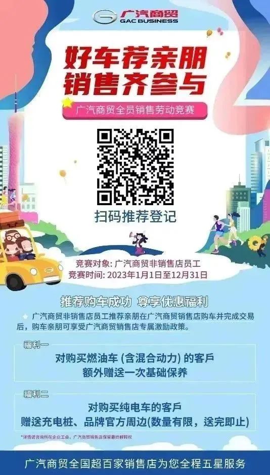 紧扣“千亿商贸”1568发展蓝图,为进一步营造全员参与销售、助力销售的氛围,2023年2月,广汽商贸发布“好车荐亲朋 销售齐参与”全员销售劳动竞赛。