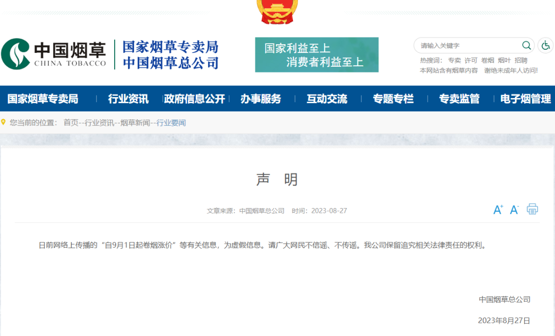 此前,网上有传言称,“2023年9月1日清晨,中国所有香烟将上涨10%。中国烟草公司宣布将所有香烟价格上涨10%,意在应对公司持续的巨额亏损。”引起不少网友的关注。