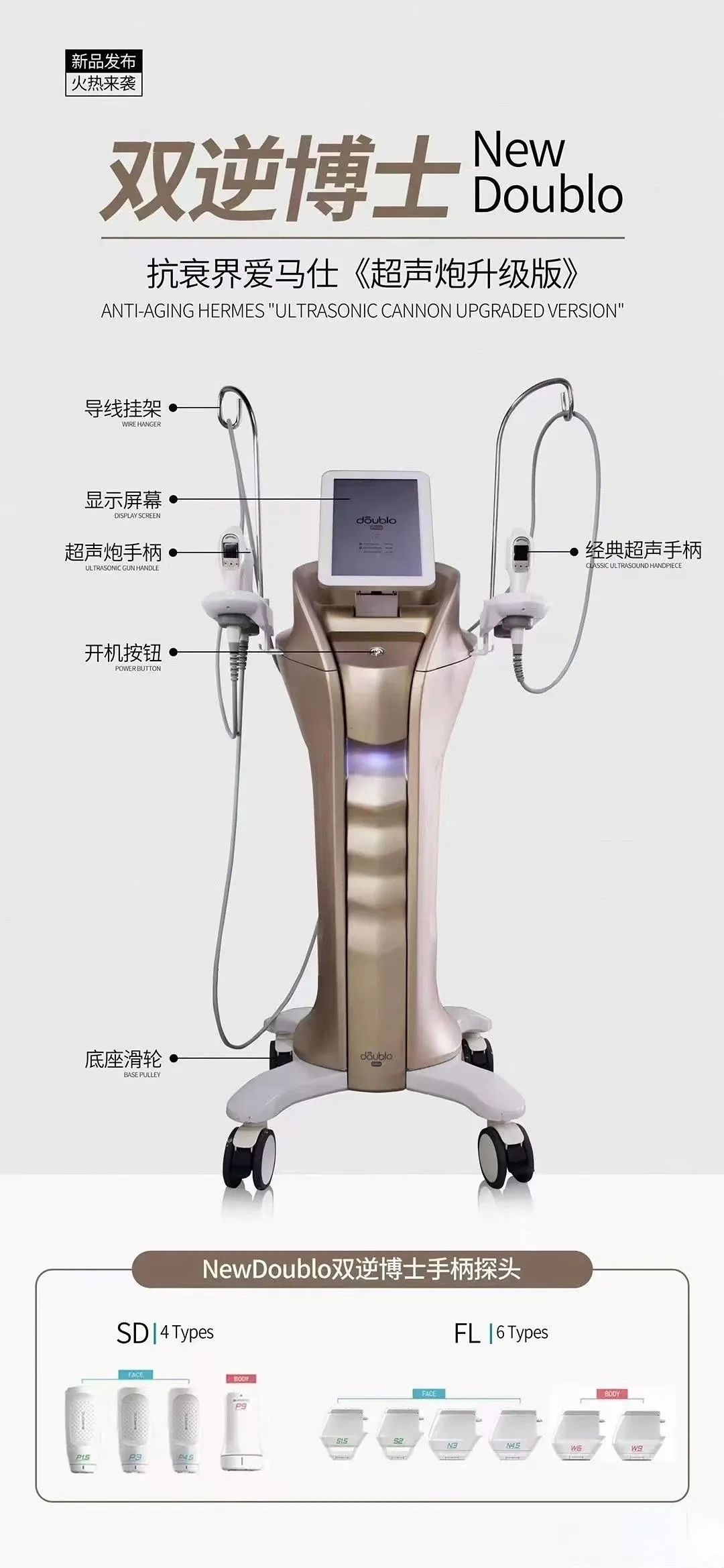new Doublo超声设备适用人群广泛,包括各种因为肌肤下垂、失去弹性以及脸部老化等人士,可以有很好的护理体验。