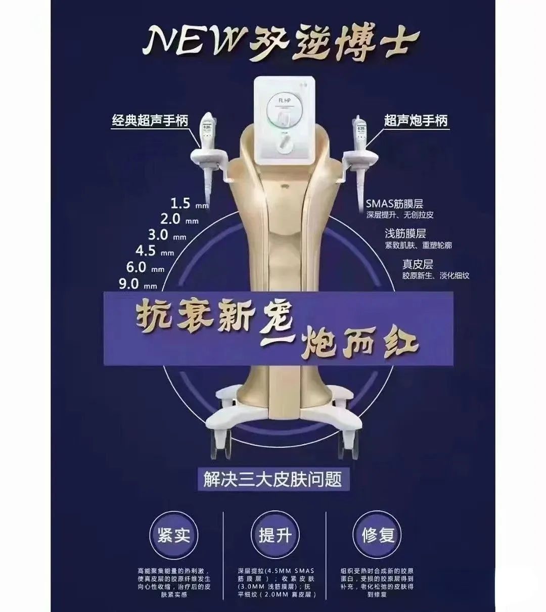 它的温度是在皮下产生60-70度的高温能确实有效的刺激胶原蛋白收缩和增生,不伤害表皮组织,达到最佳除皱的紧致提升效果。