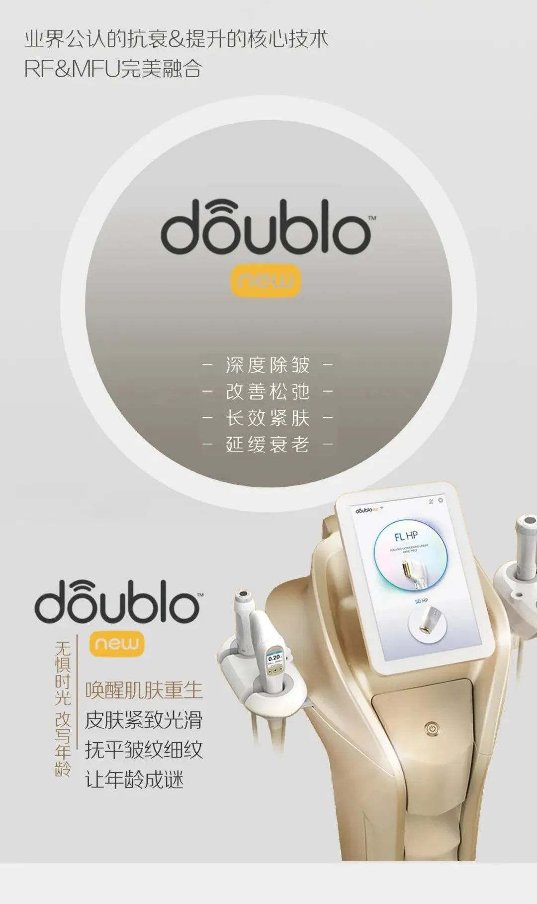 new Doublo是韩国Hironic公司旗下Doublo系列的新一代超声波美容仪器。new Doublo超声设备是一个双能量提升系统。将业界公认的抗衰、提升核心技术RF&MFU完美融合,通过非侵入的方式作用于操作部位。
