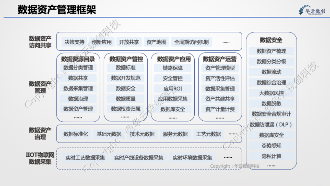五纵数据资源目录、数据资产应用、数据资产运营和数据安全。其中底层的IIOT物联网数据采集是指在智能制造行业内的数据采集,关注在“人、机、料、法、环、测”等方面的数据资产,无这类数据的企业可以不考虑这一层。