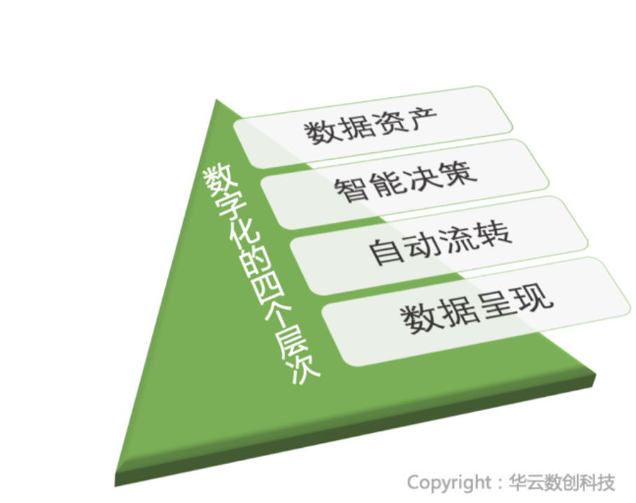 中国的企业千差万别,处于不同的发展阶段,数字化更是处在不同环节。通常而言,数字化可以分为四个层次:第一阶段是数据呈现,其次是数据流转,再次是智能决策,最高层是数据资产。
