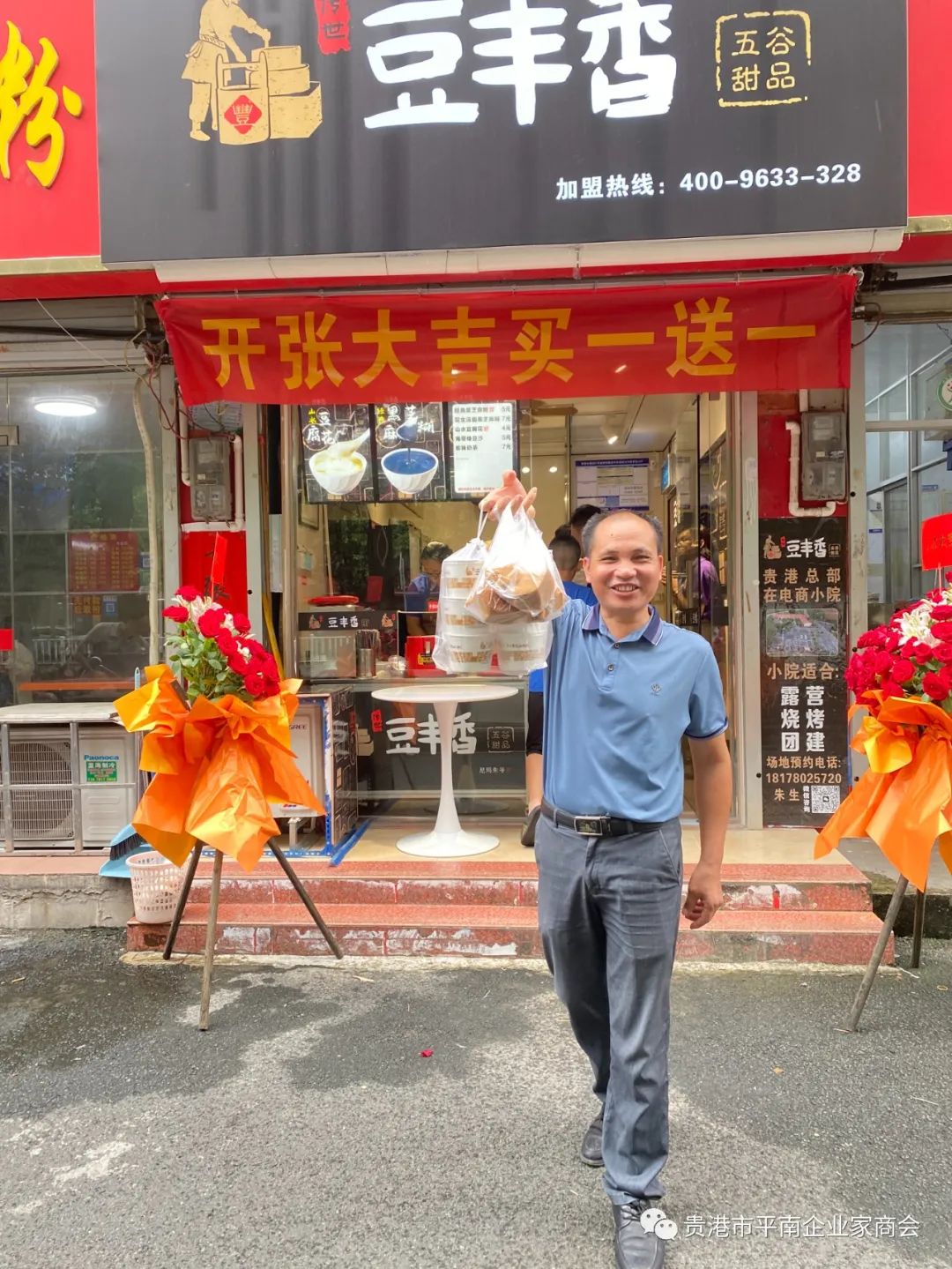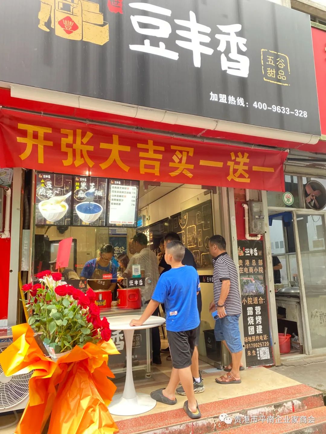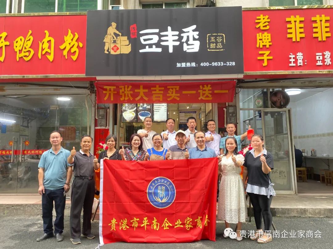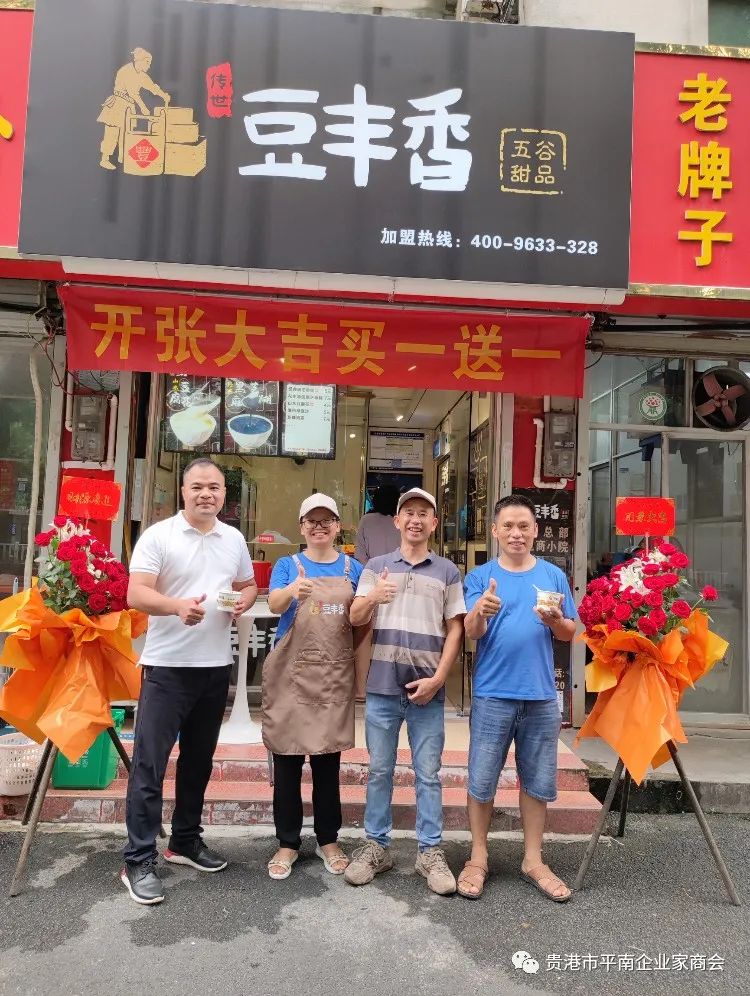 2023年8月28日上午,贵港市平南企业家商会会员单位朱滨的电商小院出品的豆丰香甜品荷城新苑店开业大吉,商会会长胡运喜、监事长苏崇昌、常务副会长郭志斌、秘书长农智富、副会长刘旭炎、李钊锋、理事陈燕、会员代表等一行前往恭祝开业大吉、生意兴隆!
