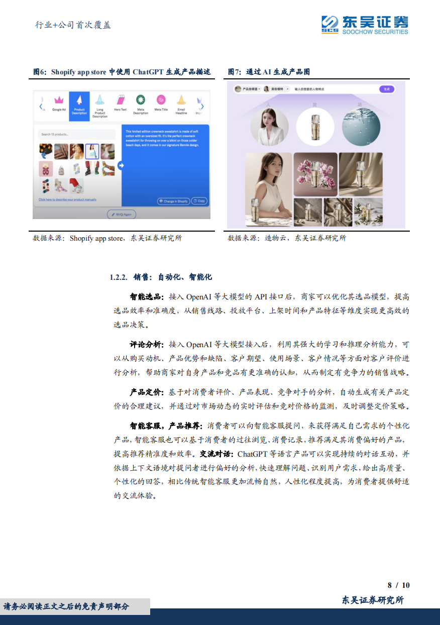 推广环节:助力商家在营销内容生产、广告精准投放和 SEO 等方面提升效率。销售环节:提升智能选品、评论分析、产品定价、智能客服、产品推荐等方面的精准度。