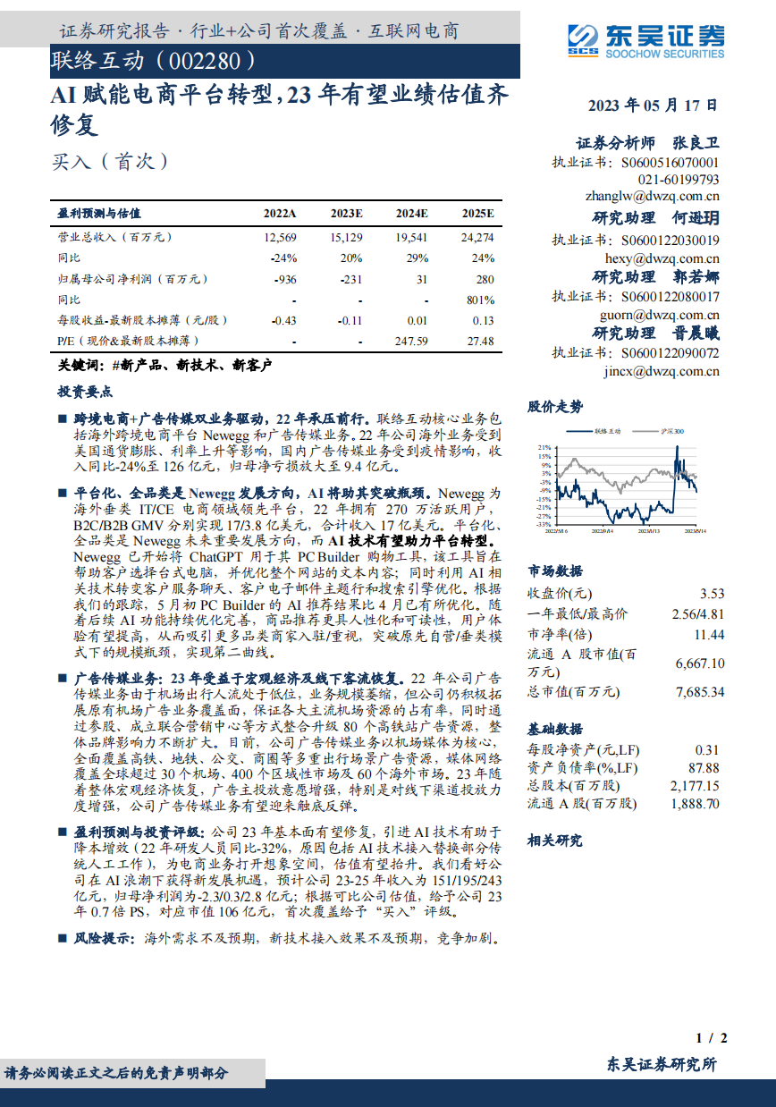 5、联络互动:AI 赋能电商平台转型,23 年有望业绩估值齐修复。