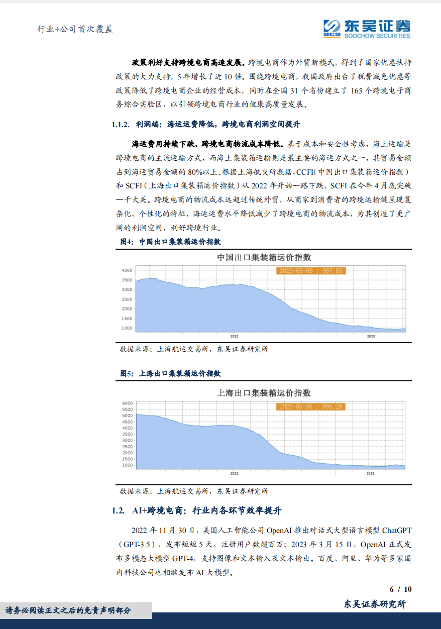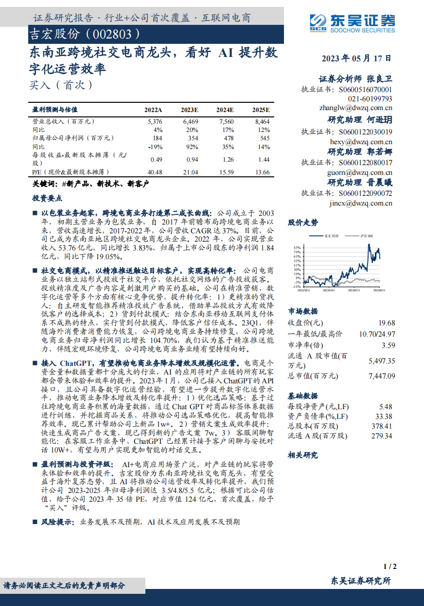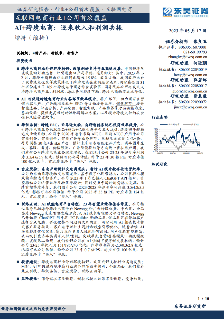 公司跨境电商业务采取泛品+精品+亿迈生态平台三大战略,连续四年超额完成业绩目标。公司于 2020 年着手布局 AIGC,目前AIGC 应用于公司智能刊登、智能调价、智能广告等业务环节,累积生成文案 2 亿+套,每月调整 30亿+条 sku 广告,预计未来可在智能选品开发、商品图片生成、客服、备货、价格预测、广告智能投放等方向进一步拓展应用。
