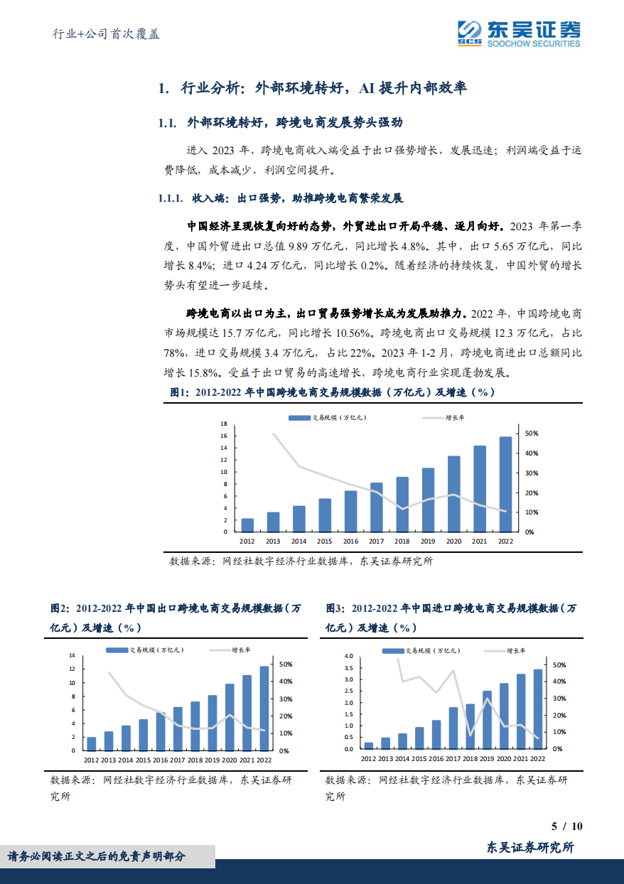 中国经济呈现恢复向好的态势,外贸进出口开局平稳、逐月向好其中,2023 年 1-2 月,跨境电商进出口总额同比增长 15.8%。