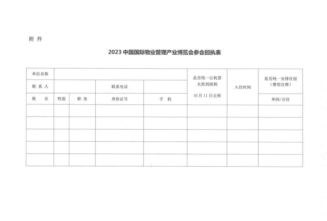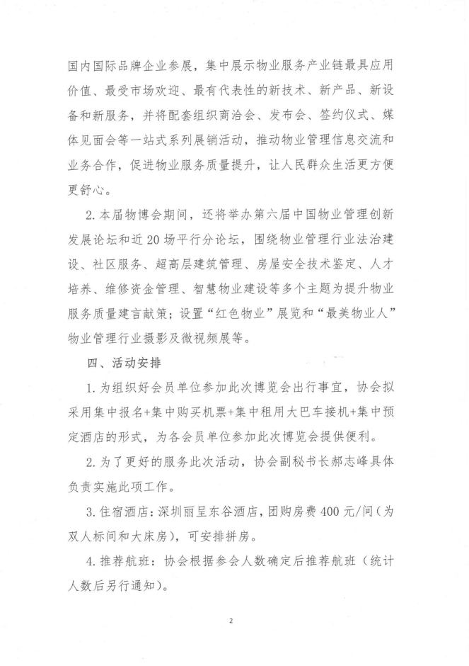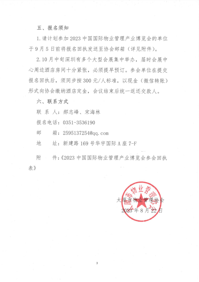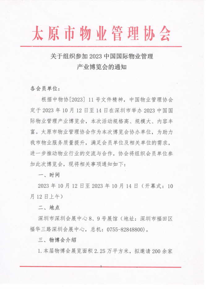 中国物业管理协会定于10月12日至14日,在深圳市举办2023中国国际物业管理产业博览会暨第六届中国物业管理创新发展论坛。市物协已发通知组织会员参加,请计划参加的单位于9月5日前将报名回执发送至协会邮箱2595137254@qq.com,以便协会尽快安排下一步工作。