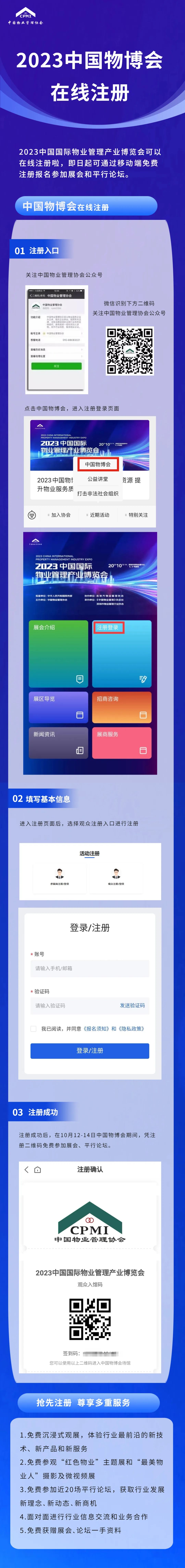 所有参与活动人员均需自行进行博览会注册,注册方式:登陆“中国物业管理”微信公众号,进入博览会注册端口,获取注册二维码。注册成功后,在10月12-14日中国物博会期间,凭注册二维码免费参加展会、平行论坛。