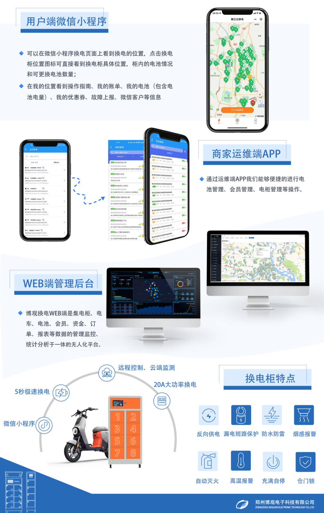 博观科技2019年开始研发换电产品及系统,一直以来专注于充换租电运营解决方案的科技创新,自主研发了“柜控《含柜控软硬件》、智能充换电柜、锂电租赁智能定位追踪系统”和配套的“充换租电云平台、小程序和APP”等系列产品,致力于持续为充换租电运营商提供高品质的一站式运营解决方案,目前换电柜销售量已累计达8000+,能够为客户提供产品维护技术支持。