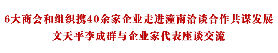 8月24日,重庆市湖南商会、山东商会、湖北商会、豫商联合会、渝台经济促进会以及民盟重庆市委直属工委携40余家企业走进潼南,洽谈合作,共谋发展。区委书记文天平,区委副书记、区长李成群与企业家代表座谈交流,热情推介潼南,诚邀广大企业家投资潼南,共享发展机遇,共创美好未来。区领导曾伟、李冬、陈建华参加。