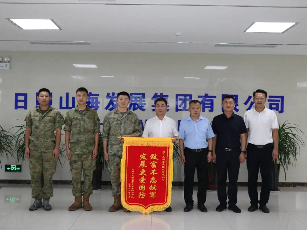 8月21日上午,中国人民解放军陆军驻日照海训部队到集团赠送锦旗,感谢山海发展集团在部队海训期间对官兵训练、生活等方面给予的大力帮助及支持。集团主要负责人、分管负责人代表集团接受锦旗。