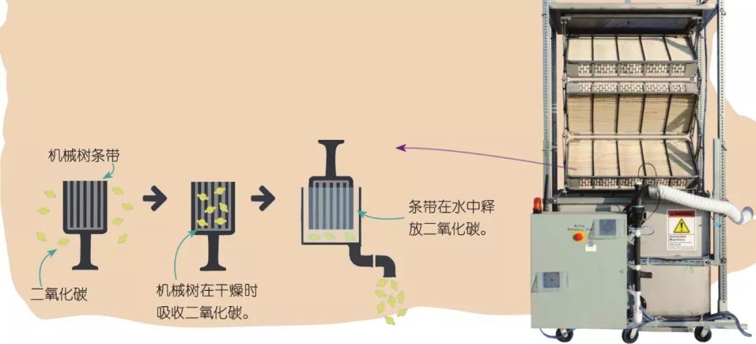 “机械树”是一种新型装置,它使用了一种树脂材料,这种材料在干燥时会与二氧化碳结合,润湿时又会将二氧化碳释放。科学家们别出心裁地将它制成长长的条带,并一层一层叠起,形成一个柱状装置。只要把这个柱子立起来,就可以借助自然风的力量,让空气通过条带之间的空隙,像筛网一样将空气中的二氧化碳拦截下来。在吸收了一定量之后,条带就不能再继续吸收二氧化碳了,这时把它浸到装有水的容器里,它就会将二氧化碳释放出来,干燥后恢复吸收。容器里的二氧化碳被吸进储罐中,用于各种工业生产,如制造干冰、生产碳酸饮料等。