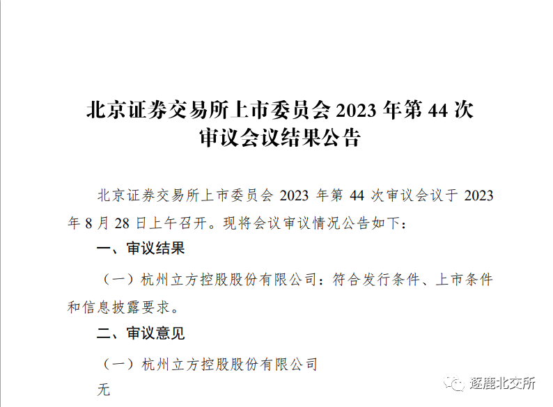 北京证券交易所上市委员会 2023 年第 44 次审议会议于 2023 年 8 月 28 日上午召开。立方控股过会。